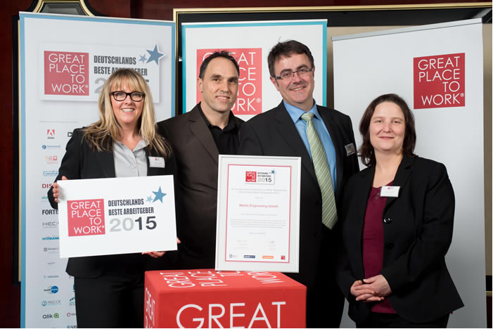 Se presentaron para representar a Martin Engineering: Michael Hengl, Director General de Europa, Melanie Scholz, Gerente de Recursos Humanos de Europa, Tanja Kosinski, Especialista de Recursos Humanos en Alemania y Lukas Bitz, Gerente de Sucursal en Alemania. El premio fue presentado por Great Place To Work®, una empresa global de asesoría, investigación y capacitación de Recursos Humanos y proveedor de la famosa lista “100 mejores empresas para trabajar de Fortune”. Según Hengl, si bien se mencionaron muchos programas y políticas para la posición de la empresa, fueron los empleados quienes ayudaron a solidificar el lugar de la empresa a través de su dedicación y participación positiva.
